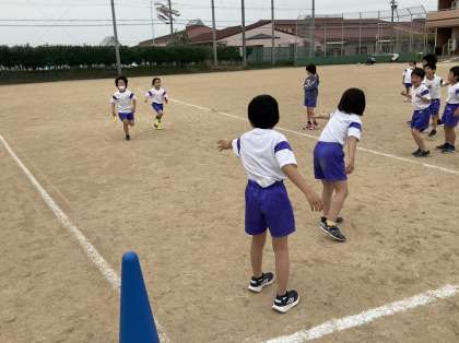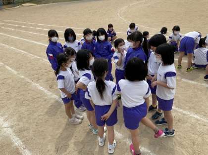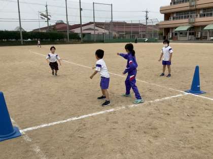 体育でリレーを行いました。各チーム走る順番を工夫して、上位を目指していました。