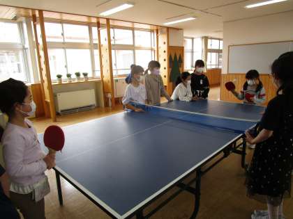 上:4年生から使うことができる卓球台で、初めての卓球を楽しんでいます。