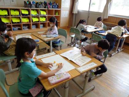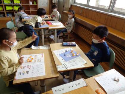 隣の人が見てないうちにブロックを隠し、何個隠れているのかを当てました。隠れてないブロックの数をを見て、ぱっと数が言えるようになってきました。