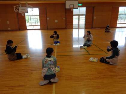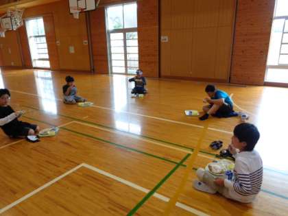 今日は、プリティランチ係の発案で体育館で給食を食べました。