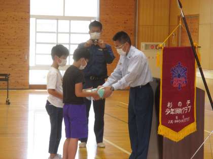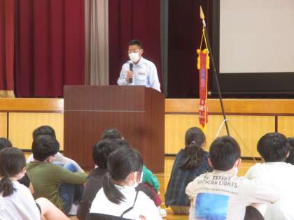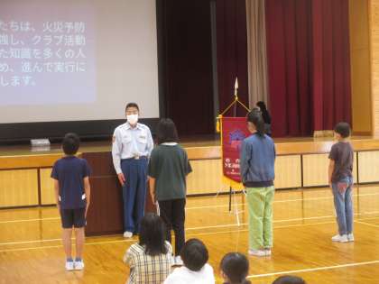 5年生 BFCバッチ授与式 公開日 2022/05/07 更新日 2022/05/07 5年生 八尾消防署の方に来ていただき、BFCのバッチと冊子を受け取り、5年生は、少年消防クラブ員となりました。代表者が誓いの言葉を発表し、自分たちが火遊びをしないだけでなく、下級生にも呼びかけること等様々な防火活動に取り組んでいくことを誓いました。