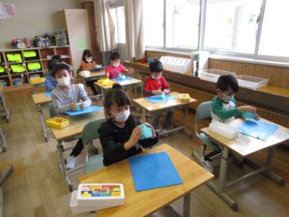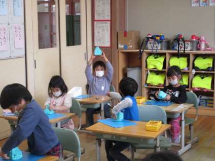 新品の粘土は、まだ固いので、ねんど体操をしてほぐしました。次は、ひも状に伸ばして活動します。