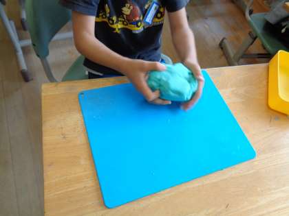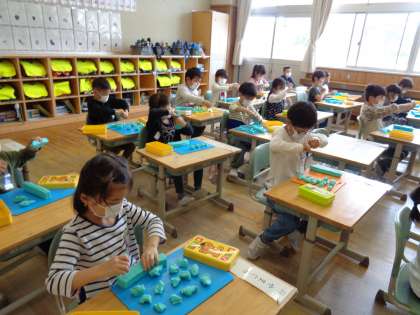 図工では、新しい粘土を使いやすくするために、「ねんどたいそう」をしました。小さくちぎったりさんかくおにぎりをつくったりまるめたりして粘土を柔らかくしました。「かんたん」「いっぱいおだんごできた」などと言いながら、楽しく活動できました。