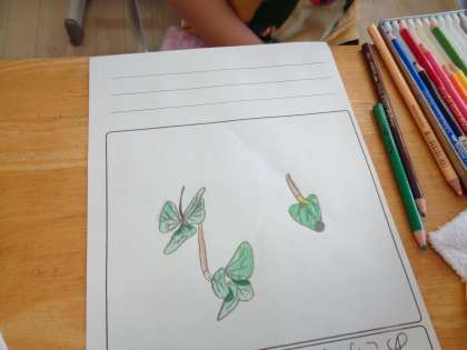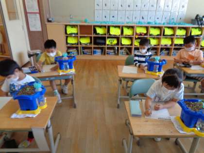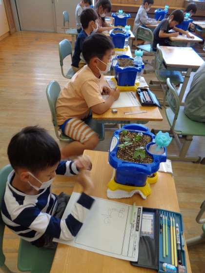 あさがおの芽が出てきたので、はっぱの観察をしました。「6つとも芽が出たよ」「はっぱがハートみたい」等自分で気づいたことをカードに書いていました。