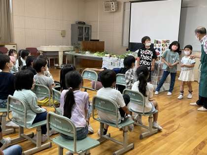 今日は、「旬の野菜や果物」に関する実感・体験学習会がありました。クイズや読み聞かせ、実際に野菜や果物を手に取って見たり嗅いだりする体験等があり、楽しそうに活動していました。