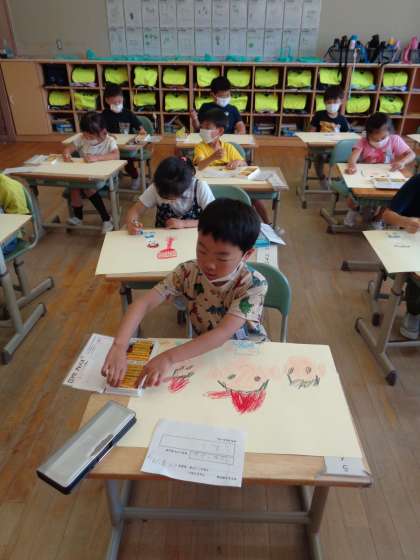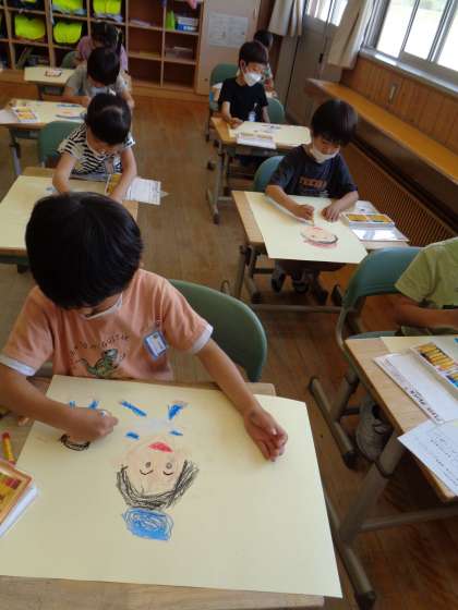 運動会で、心に残ったことを絵に描きました。にこにこ笑顔の絵や悔しそうな顔の絵等、自分の思いを表現していました。