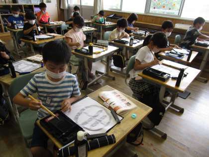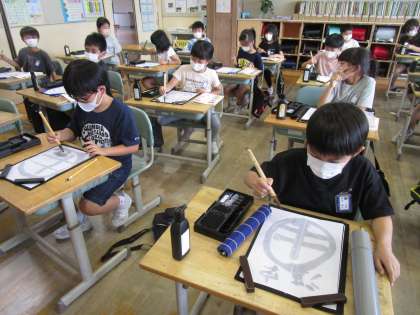 3年生 書写 公開日 2022/05/30 更新日 2022/05/30 3年生 初めて習字の学習を行いました。使用する物の名前や使い方、片付けの仕方を学習し、今日は水で半紙に線や文字を書きました。来週からは、墨液を使って行います。