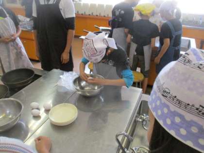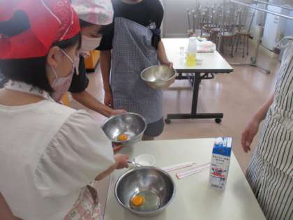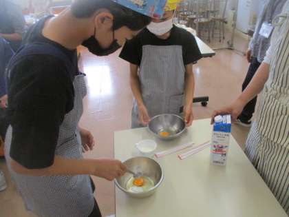 今回の調理実習は、卵料理に挑戦します。 丁寧に卵を割り、牛乳も分量をよく見て入れています。