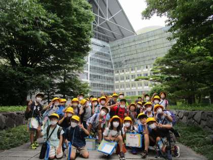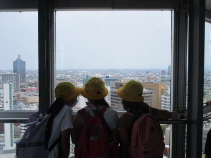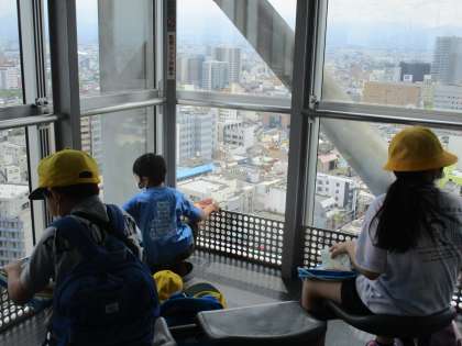 方角毎に、特徴や見える建物を観察し、ワークシートにメモしていました。