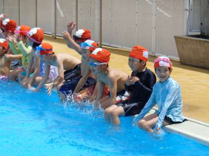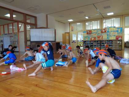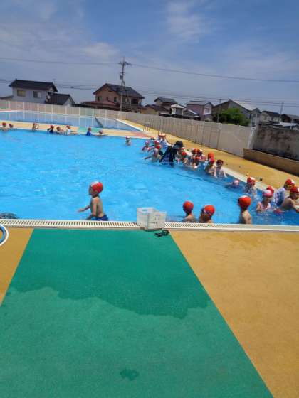 準備体操をしてから、プールに入りました。自分の体に水をかけたり、お宝探しをしたりして水と仲良しになりました。