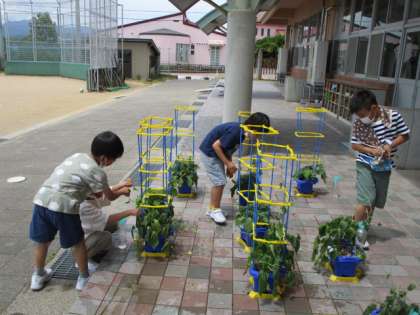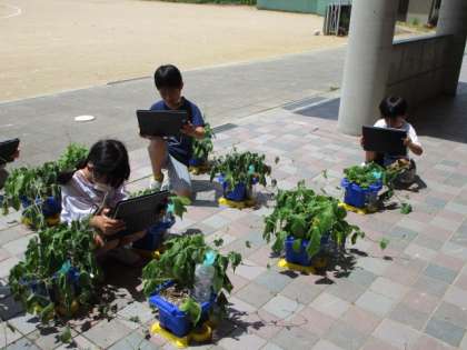 1年松組 あさがおのお世話 公開日 2022/06/23 更新日 2022/06/23 1年生 「あさがおの花がさいとるよ!」 すでに2人の朝顔が、花を咲かせていました。 クロムブックで様子を撮影し、支柱を立てました。 朝顔の成長が楽しみですね。