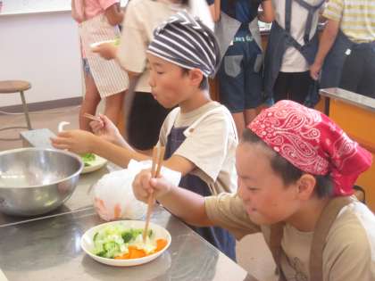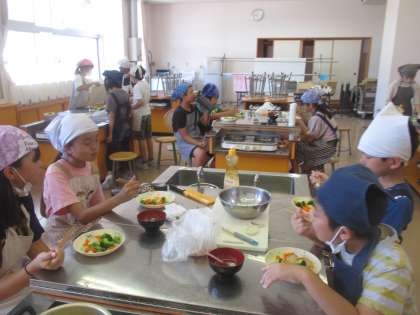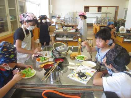 5年生 ゆで野菜サラダをつくろう2 公開日 2022/07/02 更新日 2022/07/02 5年生 完成した班から、ソースをかけてサラダを食べました。 「タマネギってゆでるとおいしい」「オーロラソースが一番好きだな」と、楽しそうな会話も聞こえてきました。 野菜が苦手で、おいしく食べられるか不安そうな子もいましたが、みんな満足そうでした。 家でオリジナルサラダをつくる宿題もがんばりましょう!