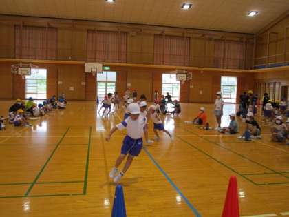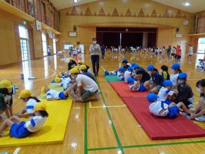 6年生のお兄さん・お姉さんと一緒に体力テストをしました。準備体操をした後、上体起こし、反復横跳び、シャトルランを行いました。お兄さん・お姉さんのおかげで、記録が伸びています。