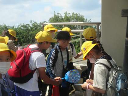 1日目の午後の活動はオリエンテーリングです。子どもの村内にあるチェックポイントを探し、班でポイントを競いました。チェックポイントにはクイズもあり、班の仲間と相談し、協力しながら答えを考えていました。