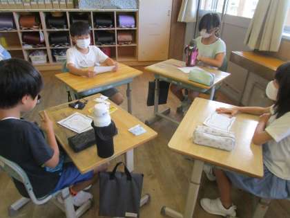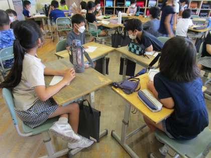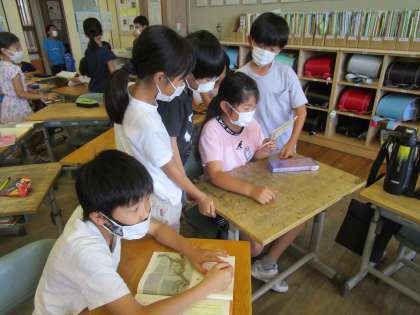 週末に読んだ本で初めて知ったことを中心に、班で紹介し合いました。友達が本を通して知ったことをよく聞いて、「へぇ」と大きく反応しながら聞いていました。また、友達が書いたおすすめの本の紹介カードを熱心に読む姿も見られ、嬉しく思っています。
