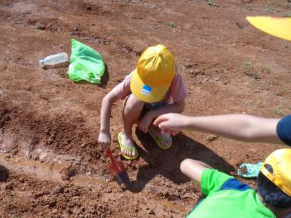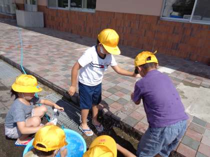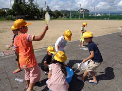 「あつくなったよ」の学習で、土や水で遊びました。土を掘って川を作ったり、うちわやストローでシャボン玉を作ったり、容器に水を入れてとばしたりして楽しみました。
