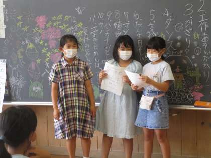 3年生 Smile3松・お楽しみ会 その4 公開日 2022/07/21 更新日 2022/07/21 3年生 ダンス係がBTSの「Butter」のダンスを披露した後に、みんなで久しぶりに踊りました。踊ってみると、忘れている動きもありましたが、それすらも楽しく、自然に笑顔があふれました。誕生日係は、クラスの友達の誕生日に関するクイズをしました。
