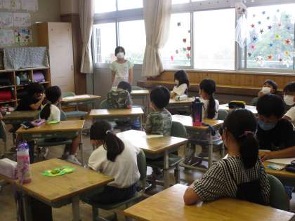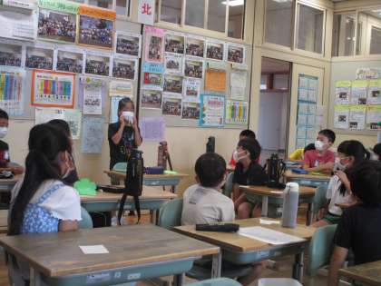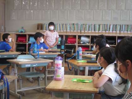 教室で、1学期にがんばったことと夏休みにがんばりたいことを、全員が発表しました。夏休みにがんばりたいことで多かったのは「PUノート」と「読書」「運動」で、他には「お手伝い」や「手話」と話す子供もいました。