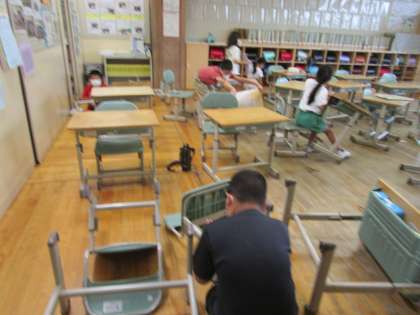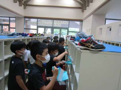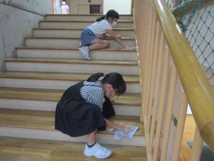 1学期間の感謝の気持ちを込めて、自分が使ってきた机と椅子の脚のごみ取り、下駄箱をきれいにしました。最後に自分の担当場所を、いつもより時間をかけて行いました。どのように掃除すればきれいになるのか、よく考えて取り組むことができています。