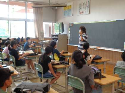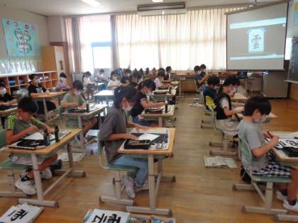 2学期初の書写は新しい先生と一緒に「雲」を書きました。正しい姿勢を意識して集中して書いていました。