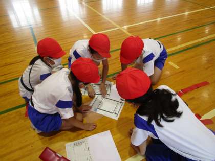 4年生 フラッグフットボール 公開日 2022/09/01 更新日 2022/09/01 4年生 試合に向けて、団で作戦をたてています。初めての競技で分からないこともたくさんありますが、友達と教え合いながら解決しています。