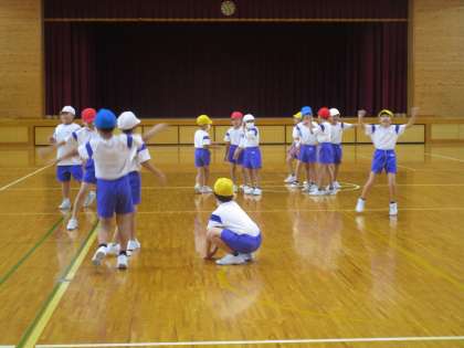 毎回、ウォーミングアップで様々な種類の曲に合わせて踊っています。今日から、色団で決めた曲に合う動きを、話し合ったり試したりしています。