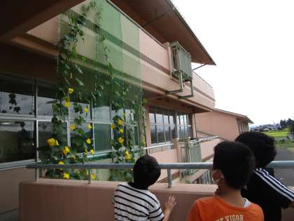 夏休みの間に順調に成長したヘチマが、2階まできました!