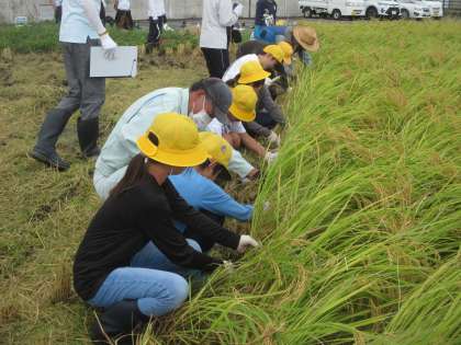 よく晴れた今日、地域の方と一緒に5月に植えた稲を刈る稲刈り体験を行いました。
