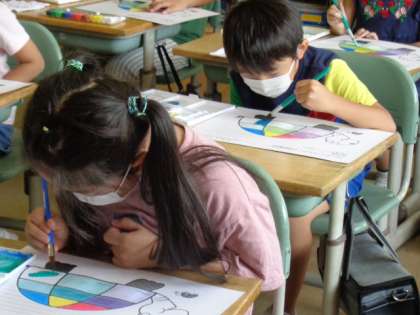 1年竹組 図画工作 公開日 2022/09/16 更新日 2022/09/16 1年生 水彩セットの使い方を学習しました。2色以上の色の混ぜ方と違う色になることが分かりました。違う色を混ぜたいときは、一度筆をきれいに洗うと、パレットの絵の具入れの部屋が汚れないことに気付きました。絵の具の量によって、色の濃さが異なることにも気付きました。