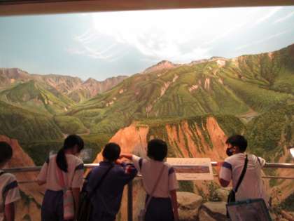 立山カルデラ砂防博物館です。土砂崩れの様子を表したジオラマを観察したり、砂防堰堤のしくみを調べたりしました。