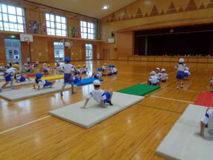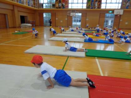 1年生 体育 マット遊び 公開日 2022/10/05 更新日 2022/10/05 1年生 マット遊びを始めました。マットの準備を自分たちで行いました。 犬歩きやクモ歩き、あざらし等いろいろな歩き方をしました。てのひらに力を入れることに慣れてほしいものです。