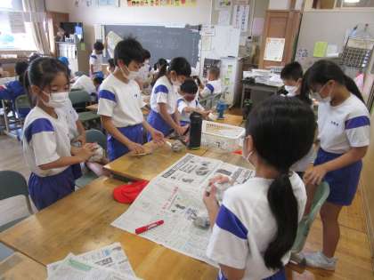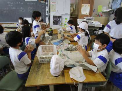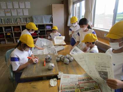 次の学習に向けて、新聞紙を丸めて練習用のボールを作りました。