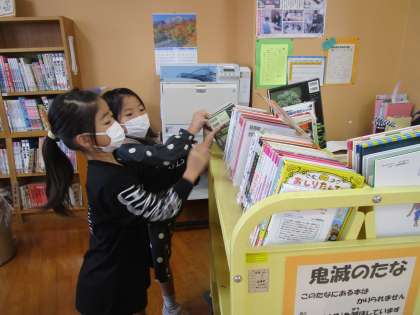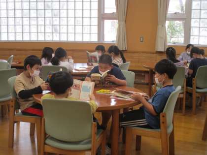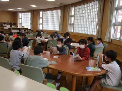 図書室で本を借りることを、とても楽しみにしている子供たちです。国語で「ちいちゃんおかげおくり」を学習していることもあって、「はだしのゲン」を読む子供が多いです。また、「グレッグのダメ日記」や「マジックツリーハウス」「ぞくぞく村」シリーズも人気があります。