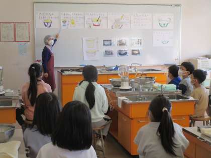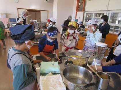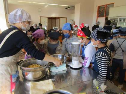 3年生 豆腐に関する実感・体験学習会 その1 公開日 2022/10/31 更新日 2022/10/31 3年生 これから国語で学習する「すがたをかえる大豆」の学習を体感するために、今日の学習会を設定しました。最初に豆腐の作り方の説明を聞き、それぞれの班に先生が入ってくださり、豆腐作りを行いました。大豆がどのようにして豆腐になっていくのか、わくわくどきどきしていた子供たちです。