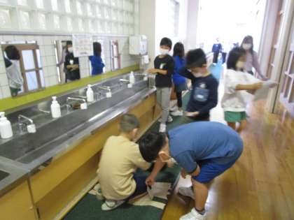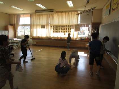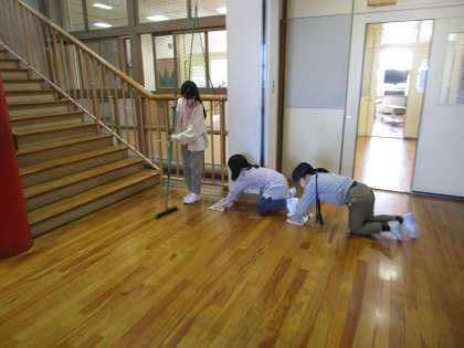3年生 清掃名人 公開日 2022/11/09 更新日 2022/11/09 3年生 午後からお客様が来校されるので、給食の前に清掃を行いました。班毎に清掃場所を担当し、動かせる物は動かして、隅々まで丁寧に清掃してくれました。さすがだなあと、感心しました。 朝のマイタイムには、進んで玄関や教室清掃をしてくれる子どもが増え、主体的に学校のために働く姿が見られます。学校を大切にする心や、学校・みんなのために働くことに喜びを感じる心の成長を感じ、大変頼もしいです。