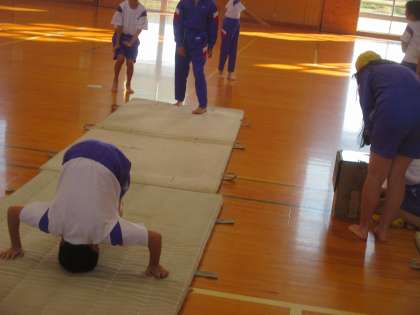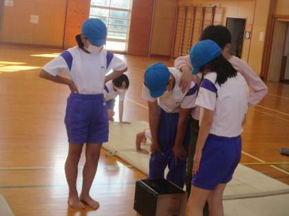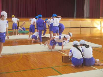久しぶりのマット運動。前転や後転など基本的な動きを復習しました。