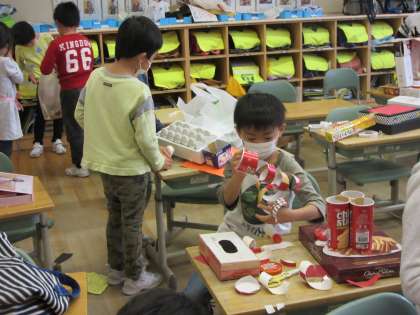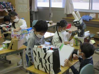 図工の作品が仕上がってきています。 集めた材料が、何に変身できるかを考えながら作っていました。