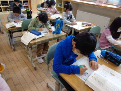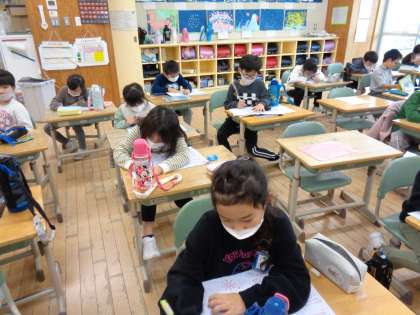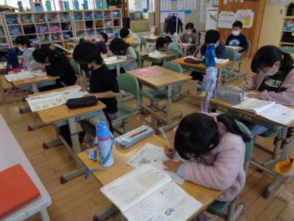 国語で「お話の作者になろう」という学習をしています。自分で物語を考えています。完成が楽しみです。