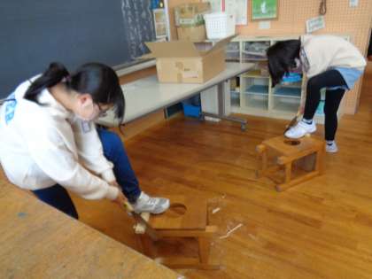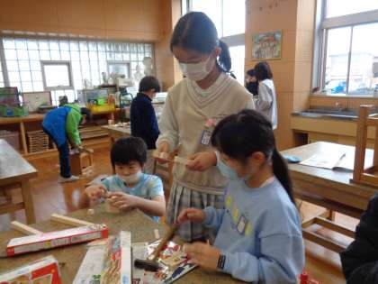 今日の図工は、図工室でのこぎりと金鎚を使いました。初めて使うのこぎりでしたが、自分の作りたいものに合わせて上手に切ることができました。完成が楽しみです。