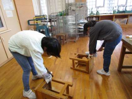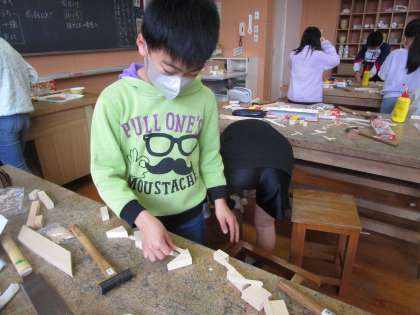 4年生 トントンつないで 公開日 2022/12/06 更新日 2022/12/06 4年生 木を色々な形に切り、組み合わせています。初めて使うのこぎりでの作業は真剣そのもの!切った後には、組み合わせ方を工夫して形作っています。