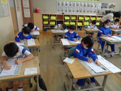 書初大会が3学期に予定されています。1年生は「硬筆墨」を使って練習しています。「へいわ」の3文字を書きました。一つ一つの文字を大きさや形に気をつけて練習しています。
