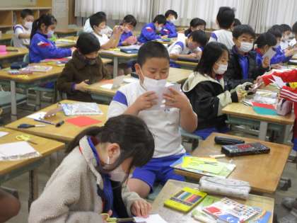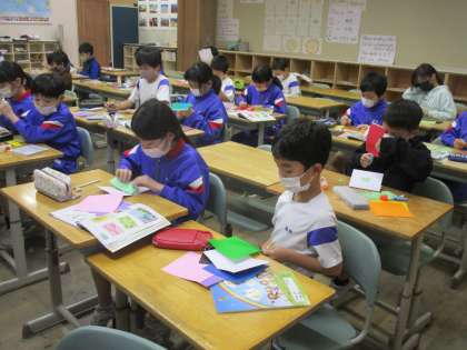3年生 2学期最後の外国語活動 公開日 2022/12/16 更新日 2022/12/16 3年生 習った英語の形の言葉を使って、今日はカード作りを行いました。立体的なカードになるように工夫して作る子供が多く、楽しく取り組んでいました。