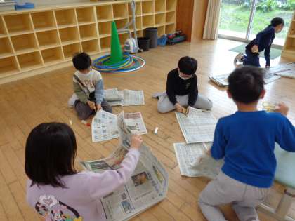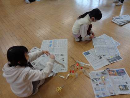 図工の学習を楽しみました。たくさんの新聞を細く切り、つなげました。