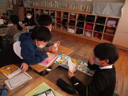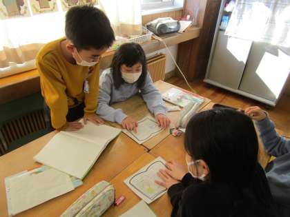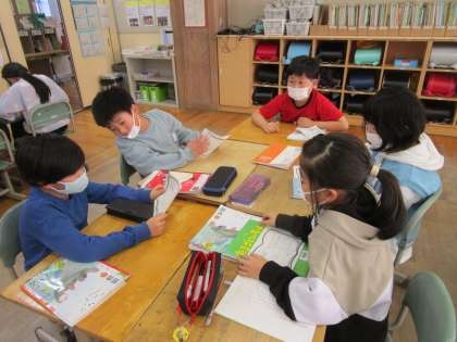 国語の時間に、冬休みに読んだ本を班の友達に紹介しました。