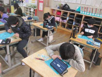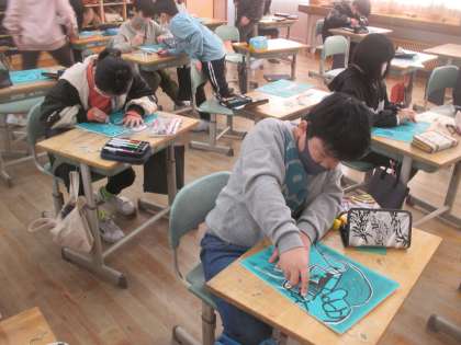 5年生 版画 公開日 2023/01/12 更新日 2023/01/12 5年生 今回は、自分の顔写真を板に転写し、それを元に版画を作成します。 今までと違い、黒い線を残す彫り方に戸惑いながらも、丁寧に作業を進めています。