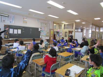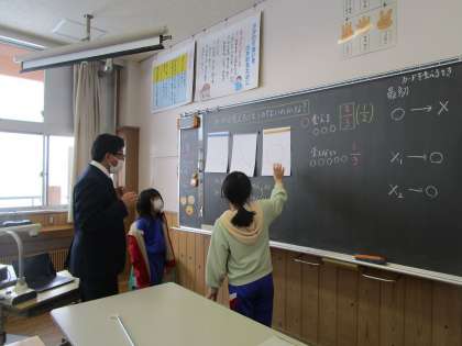 4年生 中学校の先生 公開日 2023/01/25 更新日 2023/01/25 4年生 八尾中学校から先生が来てくださいました。特別授業では、数学者たちの頭を悩ませてきた難問に挑みました。実際にカードゲームをして予想したり、結果を分析したりすることで、納得した子も出てきました。 わくわくする授業をありがとうございました。