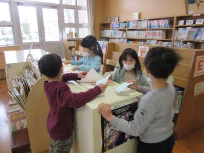 今日から図書委員会が企画したイベントが始まりました。早速問題の答えを見付けようと、本を開いている子供たちでした。