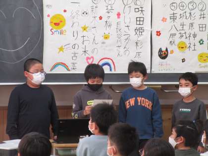 3年生 学習発表会 その1 公開日 2023/02/04 更新日 2023/02/04 3年生 3学期は、総合的な学習の時間に、「チャレンジ!杉原探検隊〜地域編〜」をテーマに、杉原の地域について学びました。そして、自分たちで調べたことをもとに、スライドや紙芝居を通して、学んだことをおうちの人に発表しました。 始めの言葉、安右衛門さんグループ、井田グループの写真です。