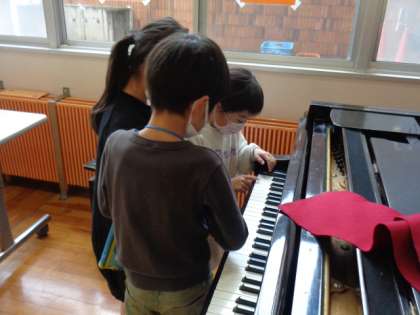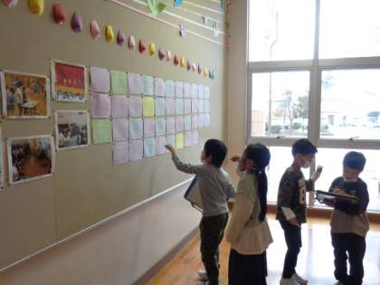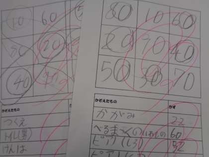 学校の中にあるものの数を数えて「かずさがしビンゴ」をしました。10から90くらいありそうなものを探して、ペアで協力して数えていました。「手紙のかずは、41だから、40に〇をつけるね」「やった。ビンゴしたよ。」など言いながら、楽しく活動しました。