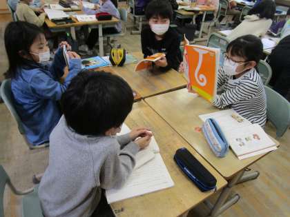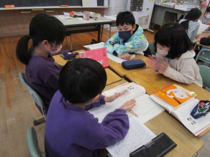 3年生 国語 公開日 2023/02/13 更新日 2023/02/13 3年生 先週学習した「つたわる言葉で表そう」の学習を生かして書いた日記を、班で紹介し合いました。「説明が分かりやすかったから、イメージできたよ」「もっと、このことを詳しく説明すると伝わるよ」などと感想を伝え合いました。一人一人が、より伝わる表現をしようと努力しています。